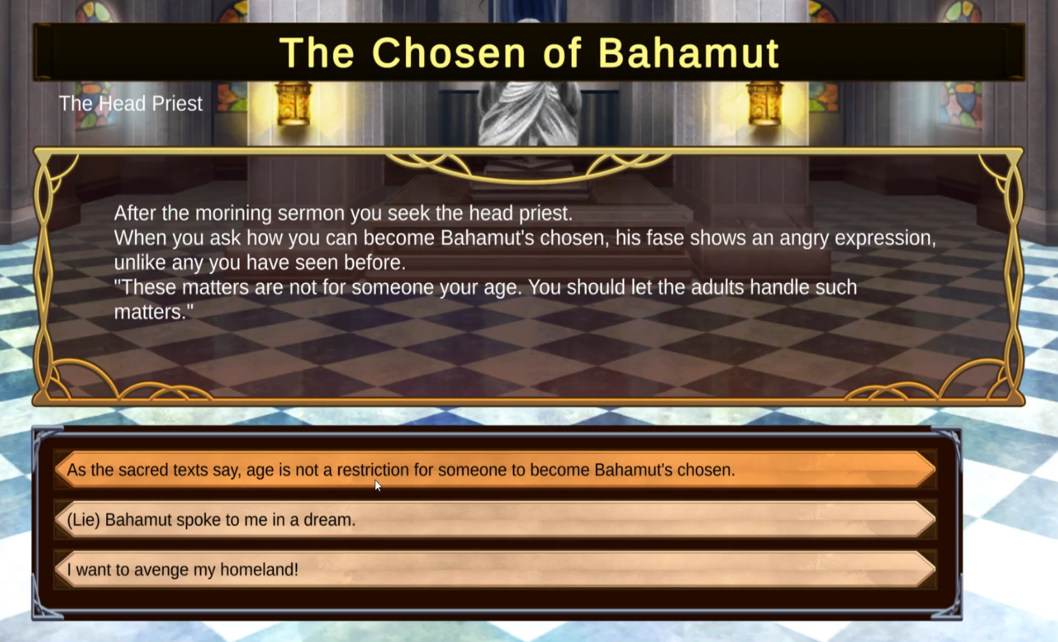 Visual novel adventure following the story flowchart of the "Chosen of Bahamut" of my Game Designs.